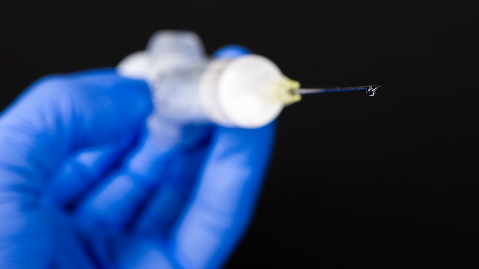 FILE - A hand in a blue medical glove is holding a syringe with a hypodermic needle. (Photo by Frank Bienewald/LightRocket via Getty Images)