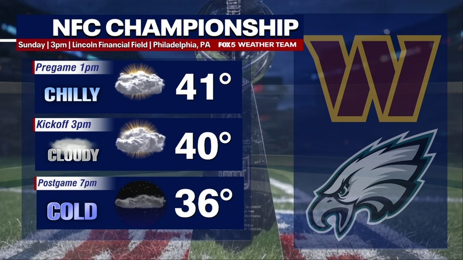 It would not be a true Commanders game without a Commander's tailgate, right?! For the fans that plan on starting up festivities earlier in the day, expect temperatures to start off in the upper 20s in Philly on Sunday morning, then steadily rising into the 30s and lower 40s by the afternoon hours.