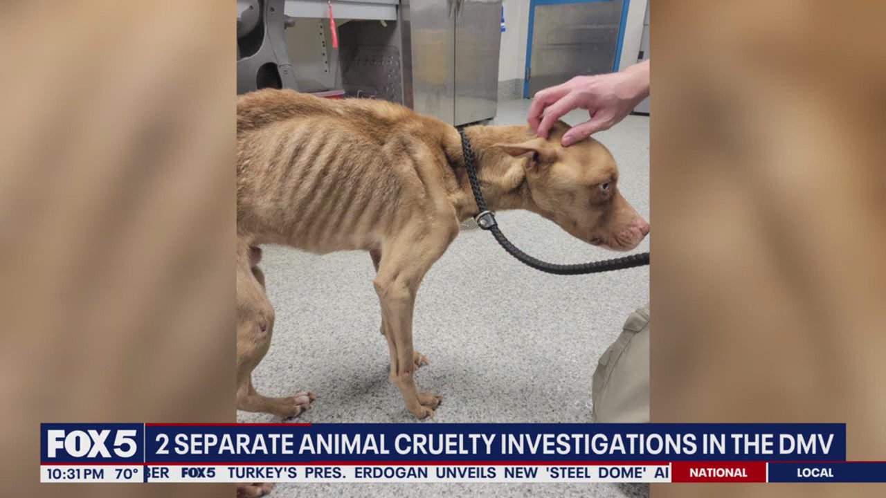 There are two separate cases of severe animal cruelty under investigation in the DMV tonight. One involves a severely emaciated dog dumped in Prince William County and in D.C. another dog was shot and killed. FOX 5's Sydney Persing reports.