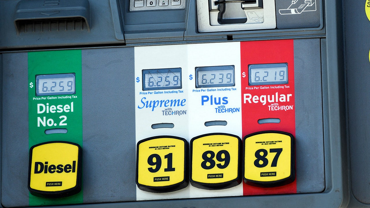 Gasoline and diesel fuel prices above six dollars a gallon are displayed on a pump at a Chevron gas station in downtown Los Angeles, California, on February 17, 2022. (Photo by PATRICK T. FALLON/AFP via Getty Images)