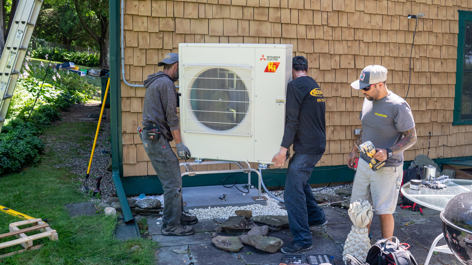CHARLOTTE, VERMONT - JULY 21: An electrician, right, and technicians from a heating, ventilation and air conditioning company, or HVAC, left and center, prepare the Mitsubishi condenser/compressor they will use to connect a residential heat pump syst