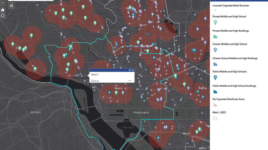 You can view the DC Department of Licensing and Consumer Protection (DLCP) E-Cigarette Enforcement Map to locate cigarette retail businesses within a quarter mile of schools in the district.