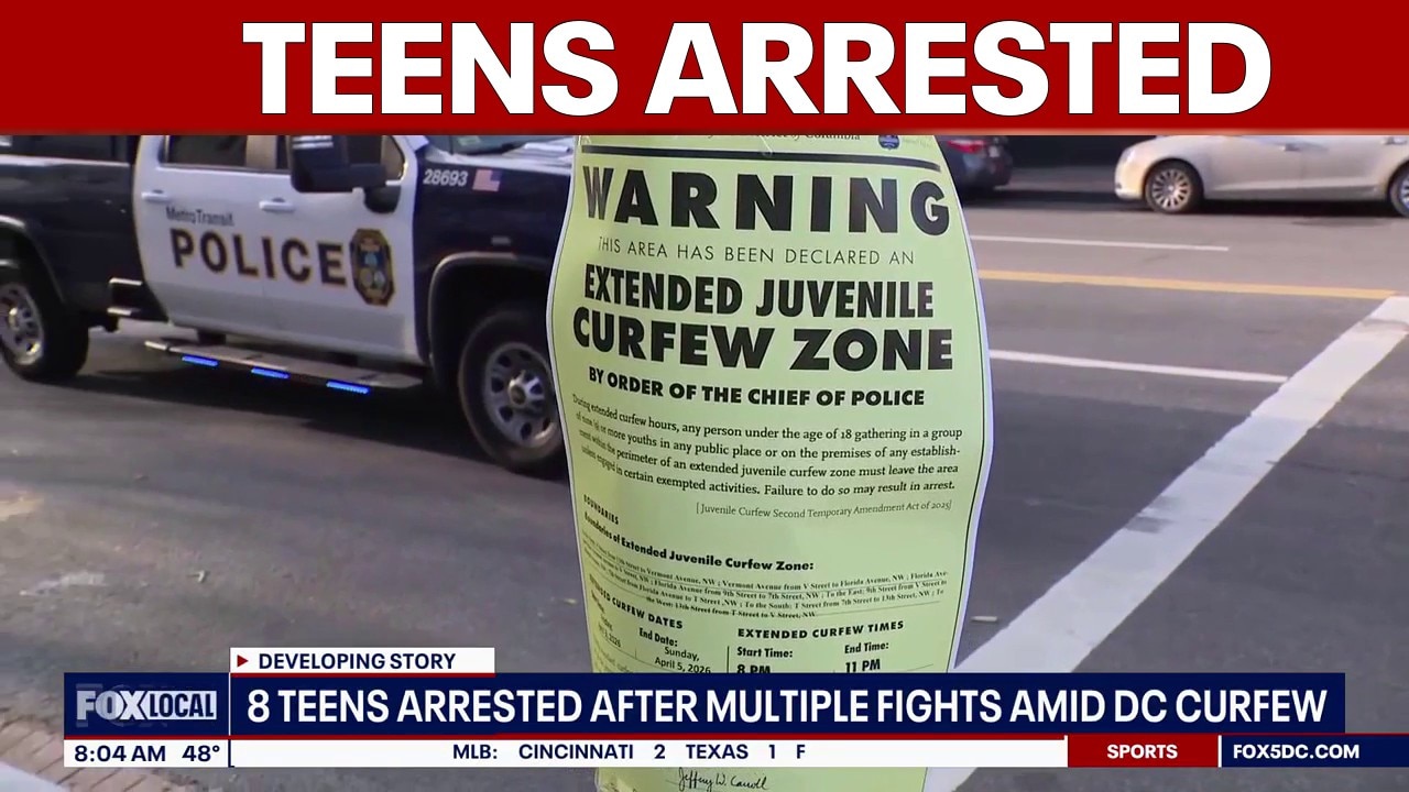FOX 5’s Melanie Alnwick says police responded to multiple disturbances between 8:30 and 10:30 p.m., ultimately taking eight teens into custody. Investigators said the groups involved were large but that most of the incidents happened outside the designated curfew zones established for the weekend.