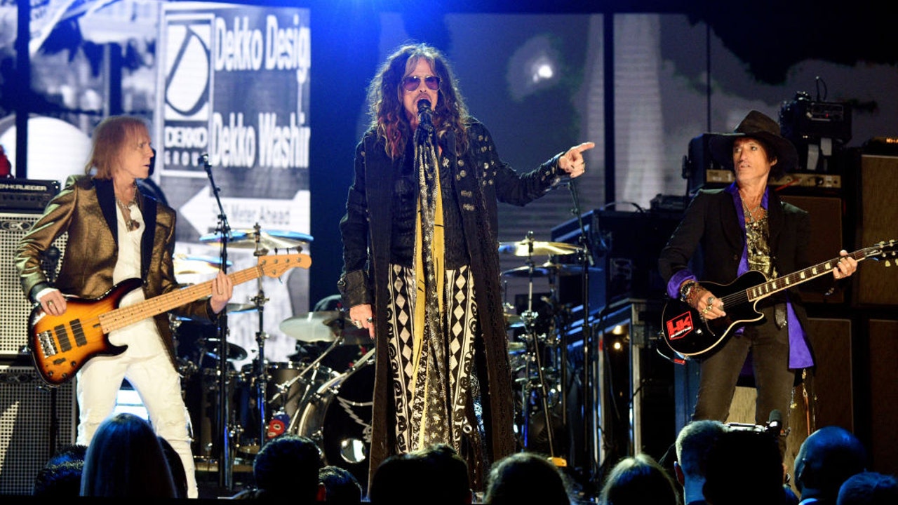 FILE - Tom Hamilton, Steven Tyler, and Joe Perry of Aerosmith perform during the 62nd Annual GRAMMY Awards at STAPLES Center on Jan. 26, 2020, in Los Angeles, California. (Photo by Kevin Mazur/Getty Images for The Recording Academy)