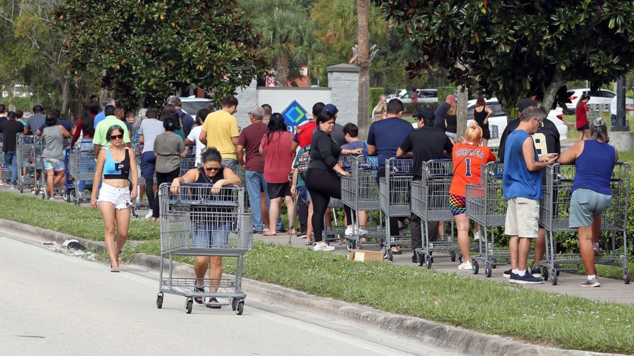 Shoppers walk to join a line stretching beyond the parking lot outside a retail warehouse as people rush to prepare for Tropical Storm Ian, in Kissimmee, Florida, on September 25, 2022. (GREGG NEWTON/AFP via Getty Images)