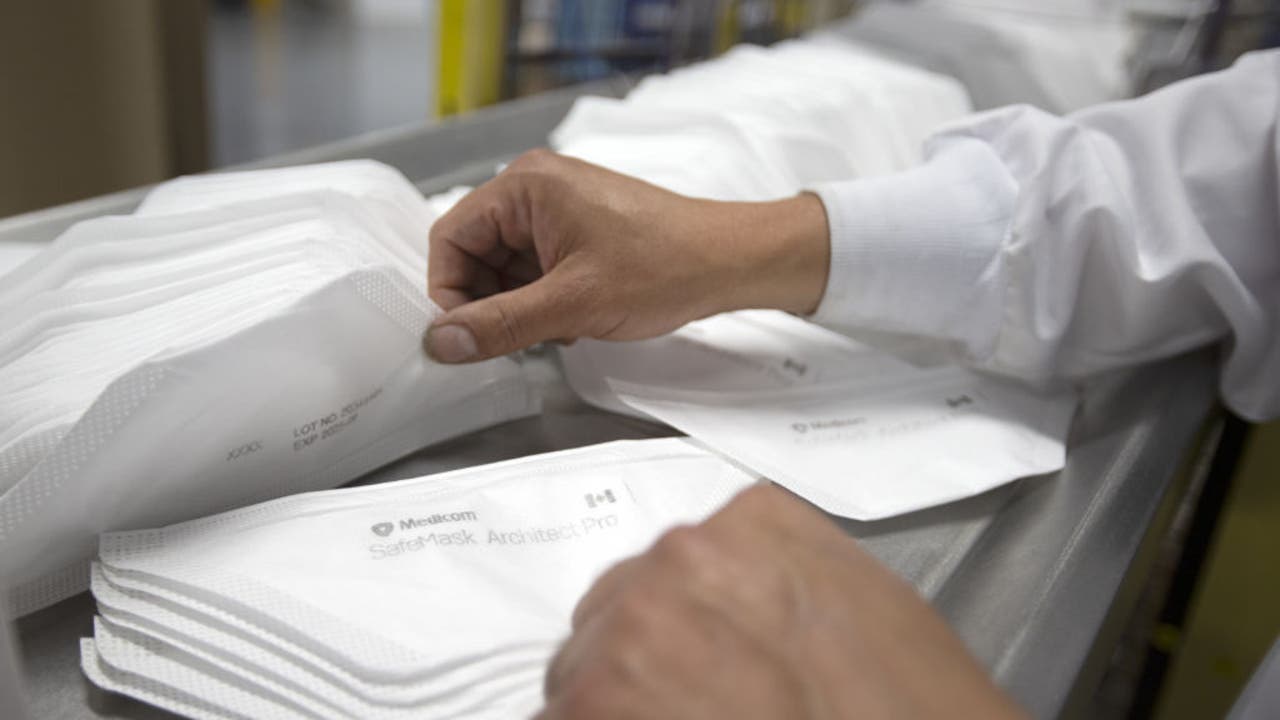 A worker collects N95 masks at a Medicom Inc. manufacturing facility in Montreal, Quebec, Canada. (Christinne Muschi/Bloomberg via Getty Images)