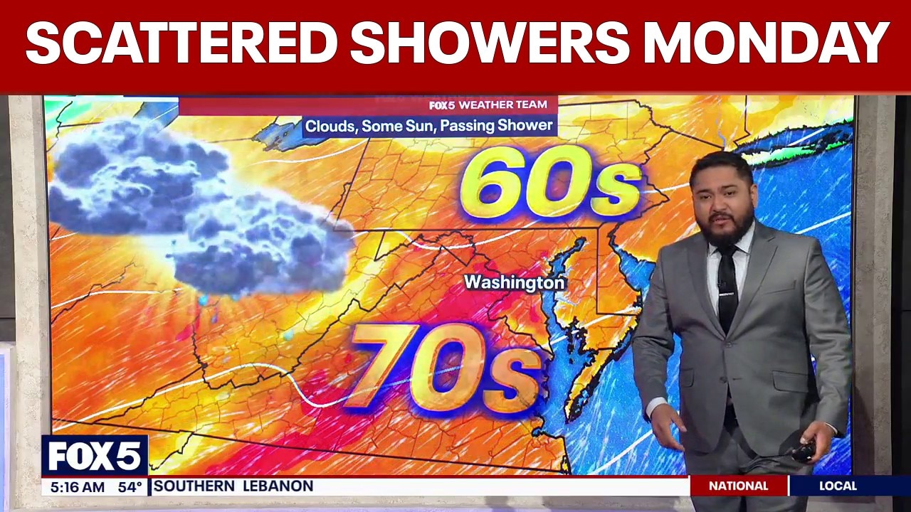 Some clouds, sun and a passing shower on Monday across the Washington, D.C. region.