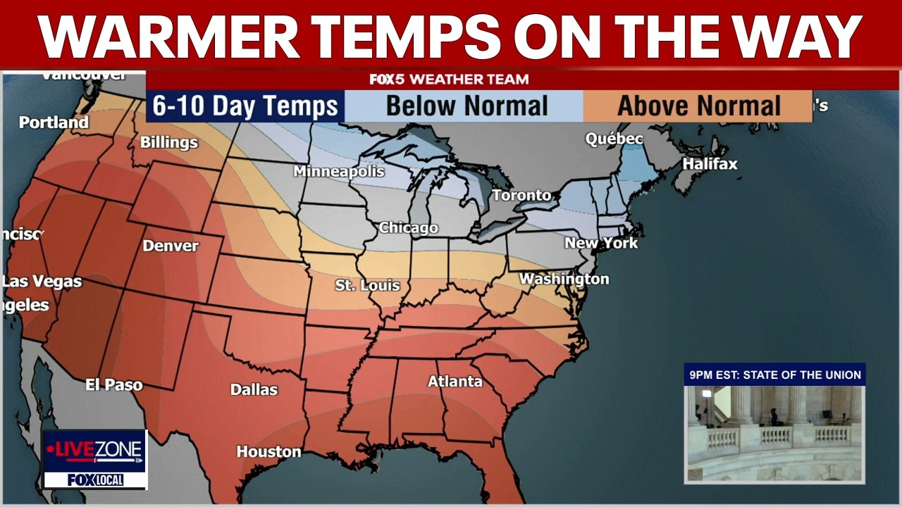 That warmup kicks in Wednesday, with highs climbing into the mid‑ to upper‑50s, says FOX 5’s Tucker Barnes.