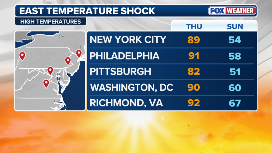 New York City is expected to feel the abrupt cooldown as well, with highs falling below average and cooler, breezy conditions settling in early next week.