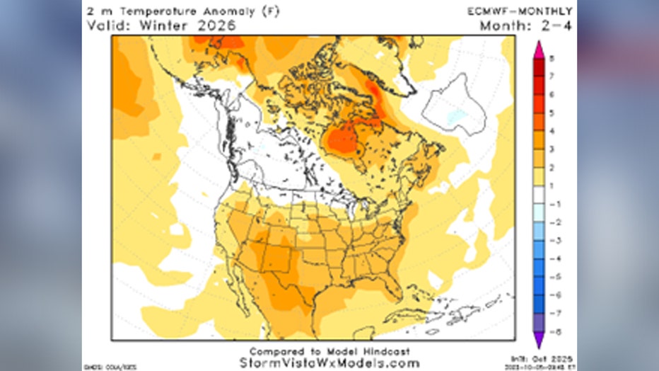 Unsurprisingly, the European model is also favoring a milder-than-normal winter across much of the country, also centered on the South and East. For the D.C. region, it suggests that the winter will be between 1-3° above the seasonal normal.