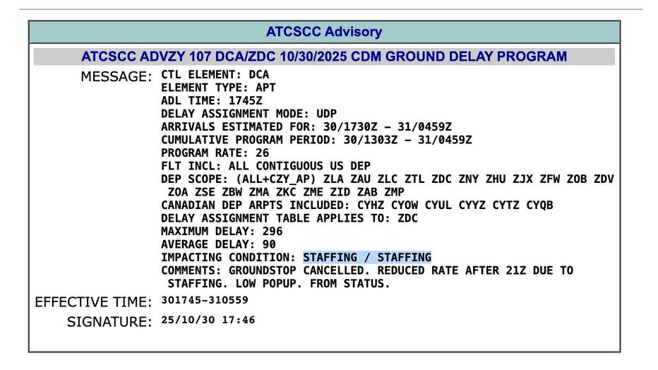 DCA ground delays average 90 minutes due to 'staffing' as government shutdown drags on