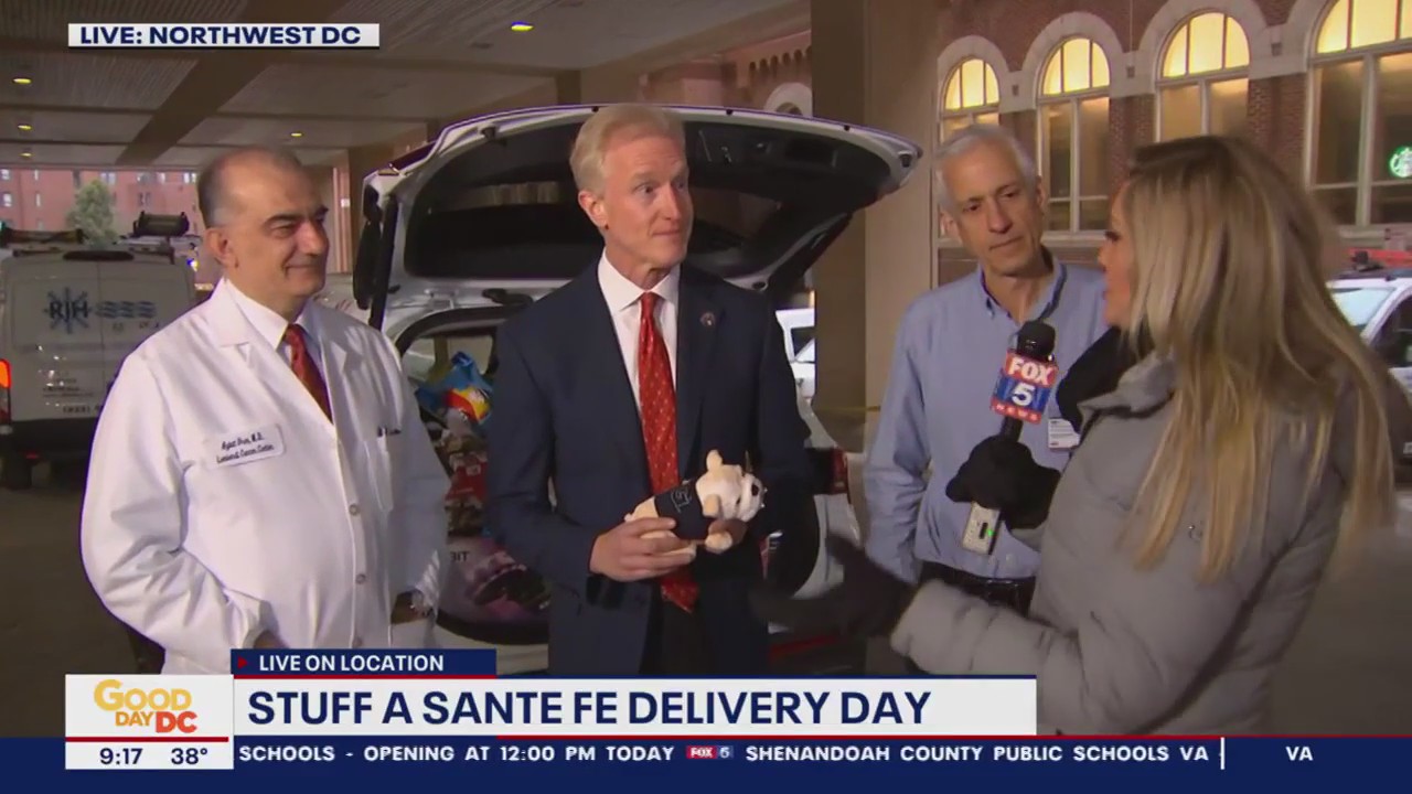 Fox 5’s Claire Anderson visited the Georgetown Lombardi Comprehensive Cancer Center with Dr. Gary Kupfer, Dr. Aykut Uren and Alexandria Hyundai's Kevin Reilly as the toys from Stuff a Santa Fe were delivered to children at the hospital.
