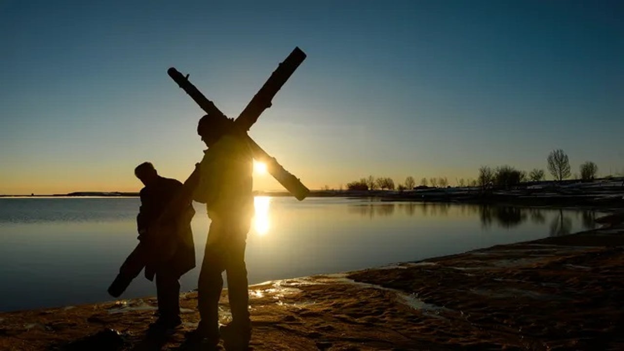 A parishioner and church usher carry a cross from the beach after the 21st annual Easter sunrise celebration service on March 27, 2016 in Boulder, Colorado. (Helen H. Richardson / The Denver Post / Getty Images)