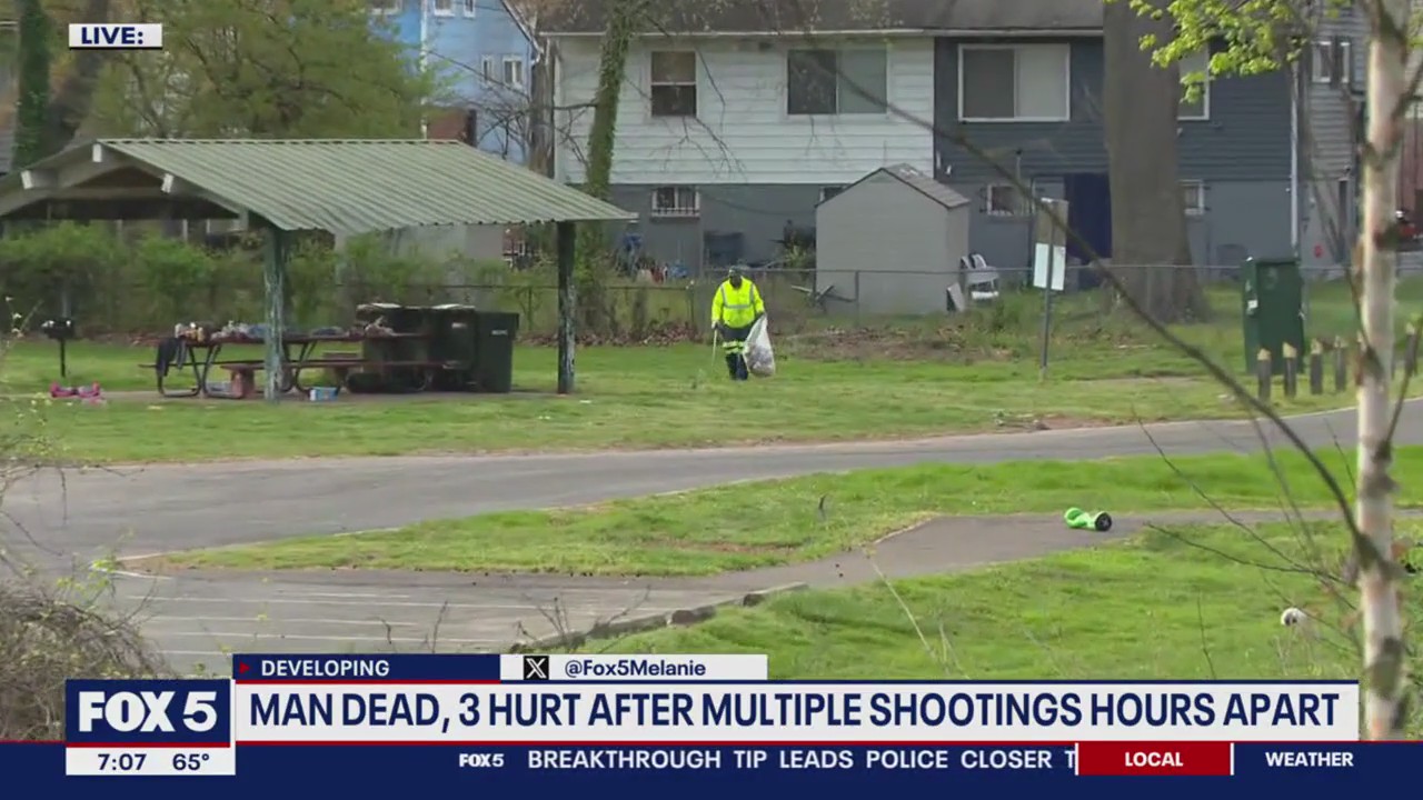 SEAT PLEASANT, Md. - One person was killed and three others wounded in shootings hours apart at two neighboring parks in Seat Pleasant, Maryland.