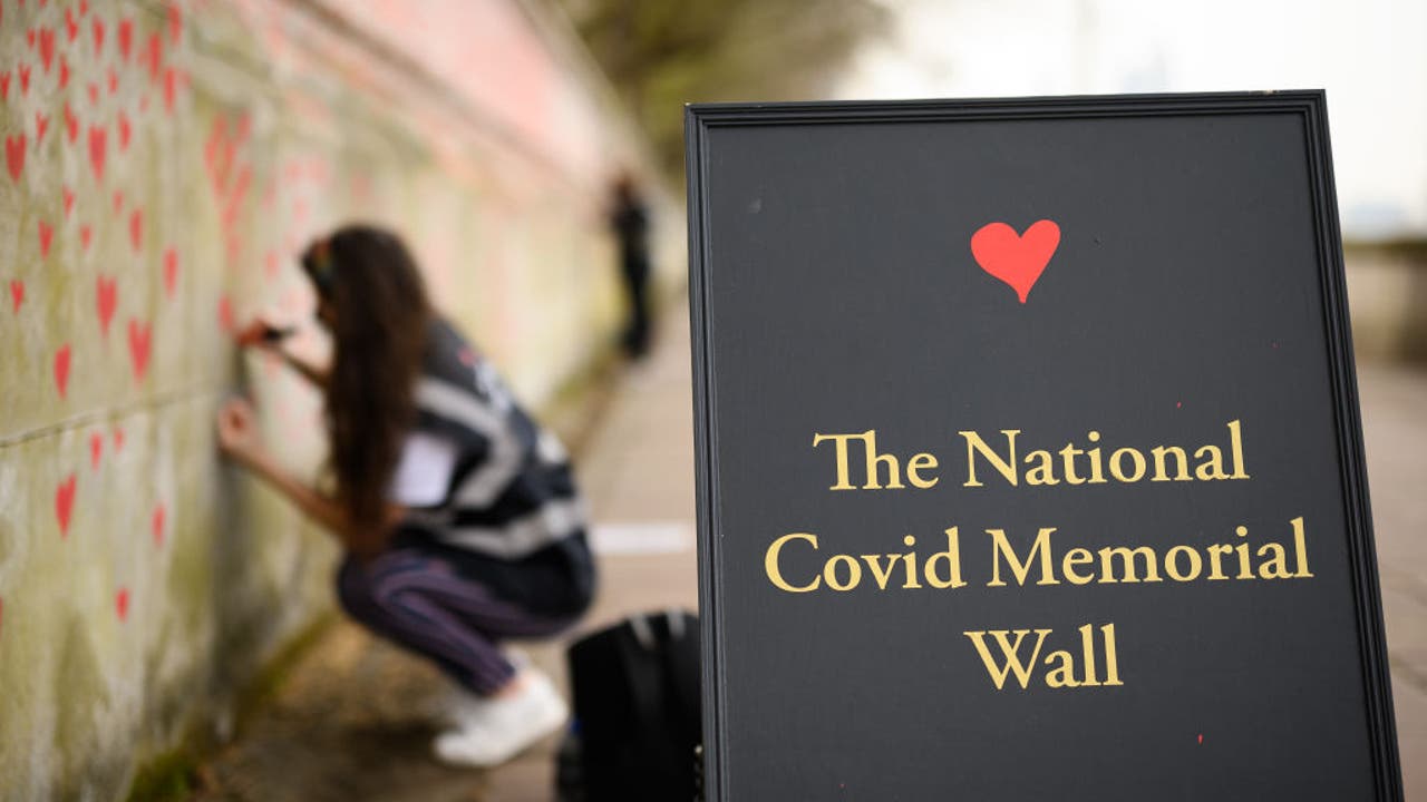 A volunteer continues to add hearts to the Covid-19 Memorial Wall outside St Thomas' hospital on March 31, 2021 in London, England. (Photo by Leon Neal/Getty Images)