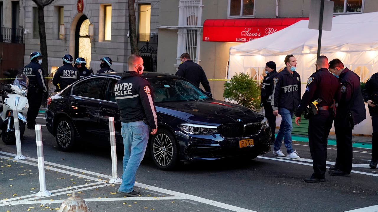 New York Police Department (NYPD) officers surround a car after it struck multiple Black Lives Matter protesters December 11, 2020 that were gathered at the intersection of East 39th Street and 3rd Avenue in New York. (Photo by TIMOTHY A. CLARY / AFP