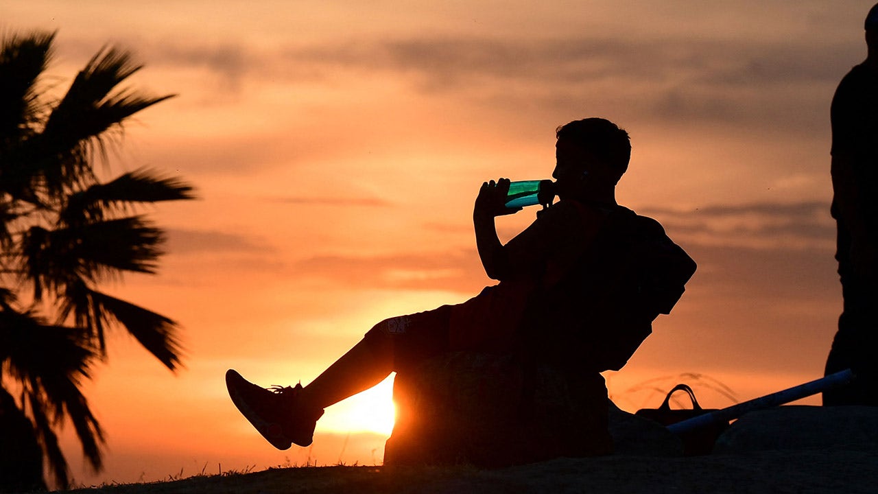 People view the sun set as a child drinks from a water bottle on June 15, 2021 in Los Angeles, California as temperatures soar in an early-season heatwave. (Photo by Frederic J. BROWN / AFP) (Photo by FREDERIC J. BROWN/AFP via Getty Images)