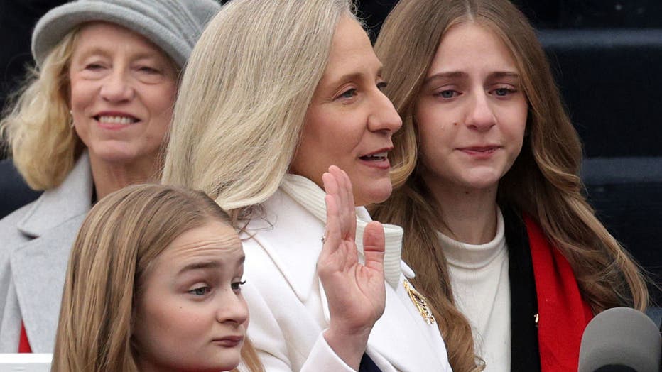 RICHMOND, VIRGINIA - JANUARY 17: Joined by (L-R) mother Eileen Davis, daughters Catherine (2nd L) and Claire (R), Virginia Governor Abigail Spanberger (C) is sworn into office by the Honorable William Mims, Senior Justice of the Supreme Court of Virg