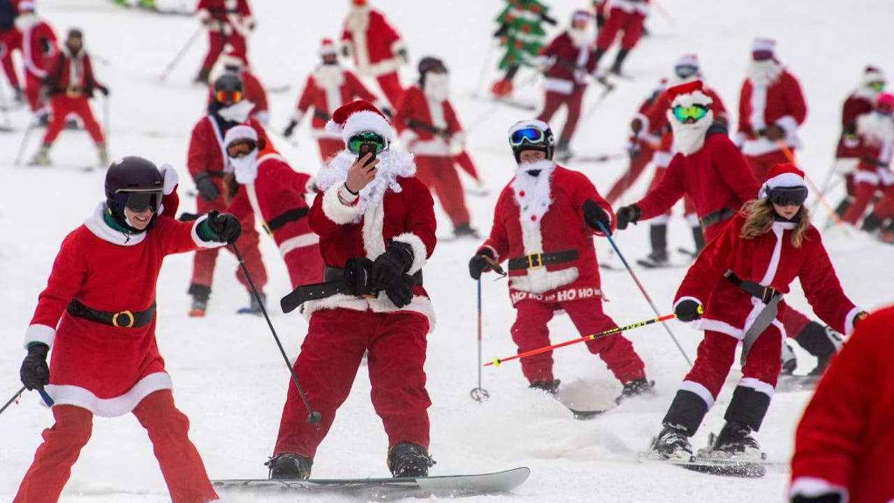 More than 300 jolly ol’ elves — all dressed in red — dashed together down a mountain with white beards and Santa hats flapping in the breeze at the Sunday River ski resort in Maine. A skiing Grinch and a skiing Christmas tree joined the party.