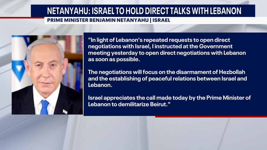 3:30 p.m. ET: Israeli Prime Minister Benjamin Netanyahu has authorized direct negotiations with Lebanon "as soon as possible" to find a solution to disarm Hezbollah.
