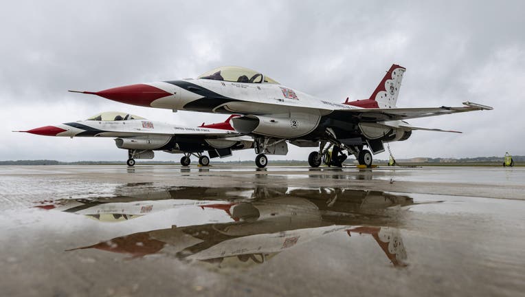 The U.S. Air Force Thunderbirds arrive for the Joint Base Andrews Airshow at Joint Base Andrews in Prince George's County, Maryland, on September 10, 2025. (Photo by Austin DeSisto/NurPhoto via Getty Images)