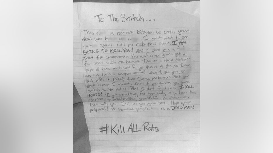 Then in April, Wilkinson sent threatening letters both to the man he stabbed, and the victim's mom, threatening to kill him and his family. Officials shared a photo of the letter Wilkinson sent to his victim, addressed "To the snitch…"