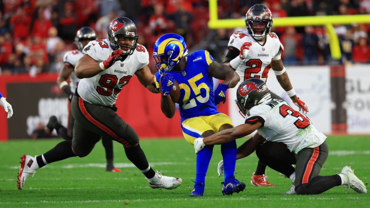 TAMPA, FLORIDA - JANUARY 23: Sony Michel #25 of the Los Angeles Rams runs with the ball as Tampa Bay Buccaneers defensemen tackle in the fourth quarter in the NFC Divisional Playoff game at Raymond James Stadium on January 23, 2022 in Tampa, Florida.