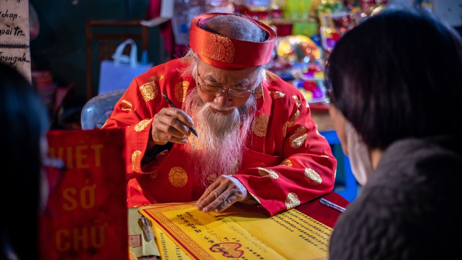A calligrapher writes down wishes to visitors to mark the start of the Lunar New Year on January 22, 2023 in Hanoi, Vietnam. (Photo by Linh Pham/Getty Images)