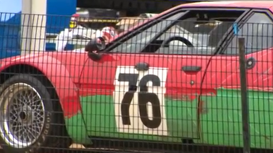 Images from the scene show a pink and green race car with 76 on the driver-side door. The car appears to be a 1979 BMW Art Car, painted by Andy Warhol.
