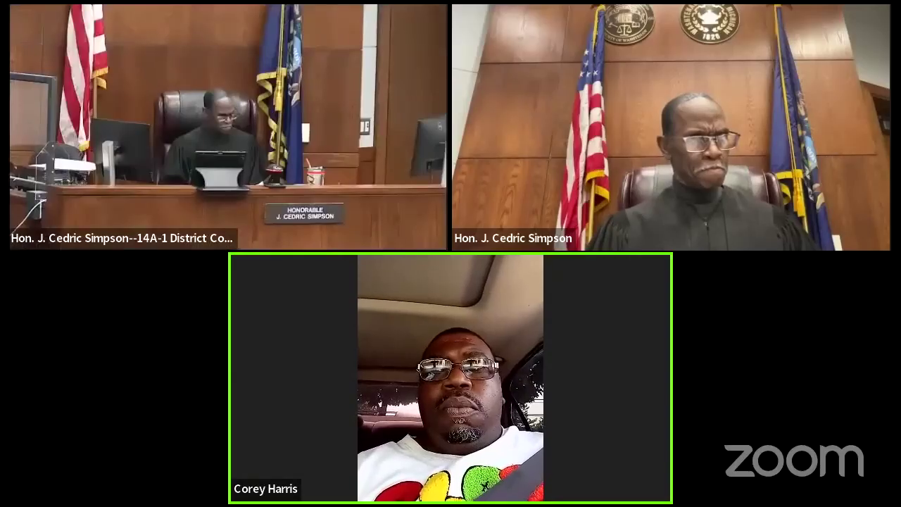 Court footage shows Judge Cedric Simpson’s dumbfounded reaction as the defendant, Corey Harris, dials into the court hearing from the driver's seat.