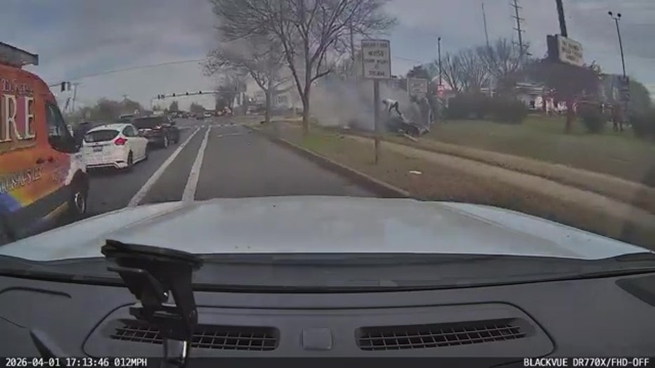 Other fire crews responded to the crash, and were able to put out the flames. Video from officers responding to the scene showed at least one first responder climbing on top of the flaming vehicle.