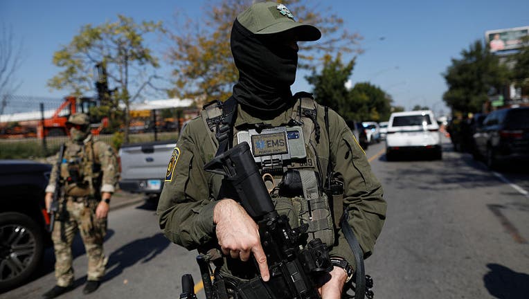 A masked US Customs and Border Protection (CBP) Border Patrol agent is seen as residents of Chicago's Brighton Park neighborhood confront law enforcement at a gas station after Immigration and Customs Enforcement (ICE) agents allegedly detained an un