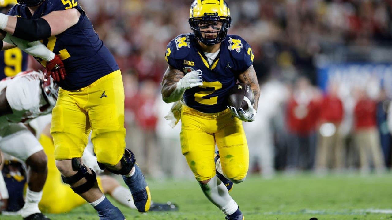 PASADENA, CALIFORNIA - JANUARY 01: Blake Corum #2 of the Michigan Wolverines runs with the ball in overtime against the Alabama Crimson Tide during the CFP Semifinal Rose Bowl Game at Rose Bowl Stadium on January 01, 2024 in Pasadena, California. (Ph
