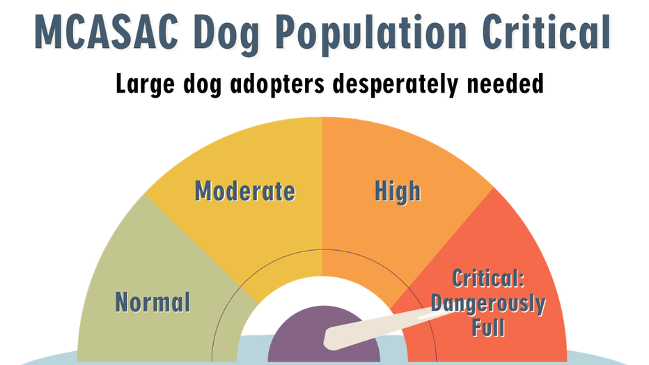 MONTGOMERY COUNTY, Md. - Montgomery County Animal Services and Adoption Center (MCASAC) is asking for immediate community support after reaching critical capacity for large dogs.