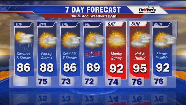 WASHINGTON - We’re in for a cloudy day in the D.C. area on Tuesday, with scattered showers arriving around lunchtime and the threat of stronger storms arriving late in the afternoon and evening.