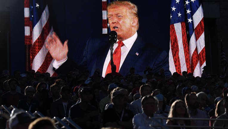 US President Donald Trump is shown on a screen as he speaks during the Independence Day events at Mount Rushmore National Memorial in Keystone, South Dakota, July 3, 2020. (Photo by SAUL LOEB / AFP) (Photo by SAUL LOEB/AFP via Getty Images)
