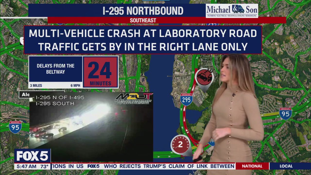 A multi-vehicle crash on I-295 is causing delays in D.C. Thursday morning.