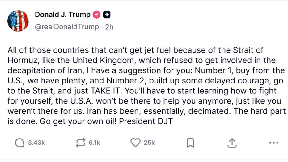 In a post on Truth Social, the president wrote in part: "I have a suggestion for you: Number 1, buy from the U.S., we have plenty, and Number 2, build up some delayed courage, go to the Strait, and just TAKE IT."