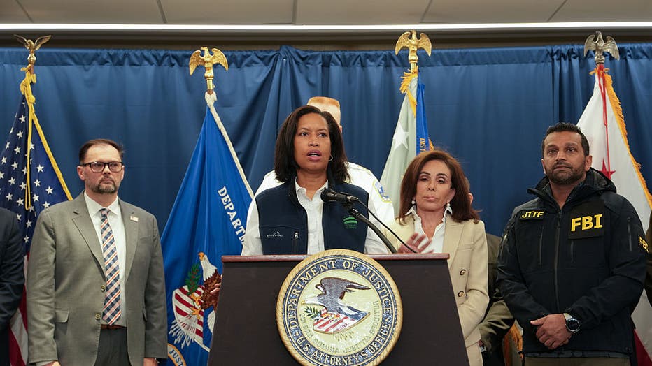 WASHINGTON, DC - NOVEMBER 27: D.C. Mayor Muriel Bowser speaks to the press as US Attorney for the District of Columbia Jeanine Pirro (2nd R), and FBI Director Kash Patel (R), look on during a press conference regarding the shooting of two West Virgin