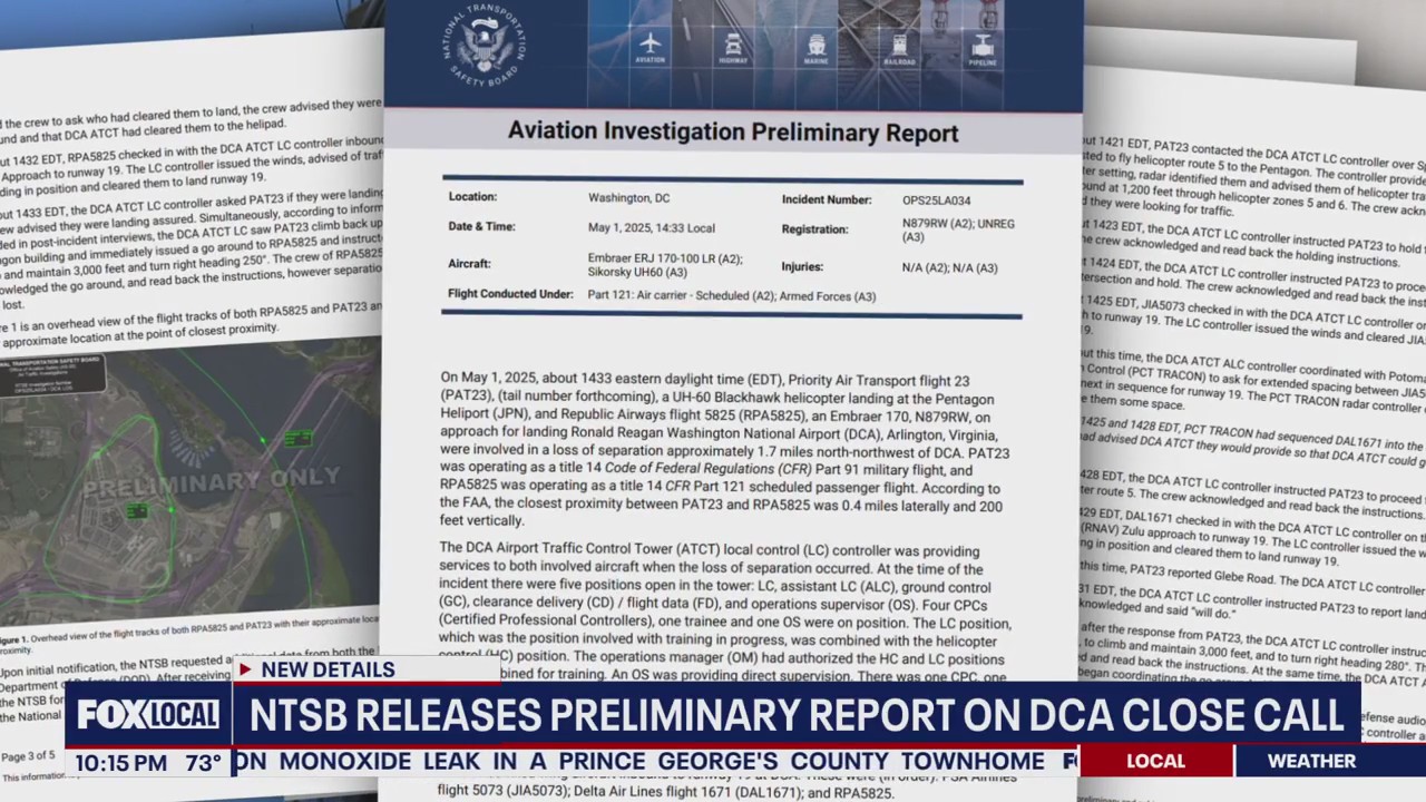 WASHINGTON - A new preliminary report from the National Transportation Safety Board (NTSB) details a close call between a U.S. military helicopter and a plane near Ronald Reagan Washington National Airport (DCA) last May.