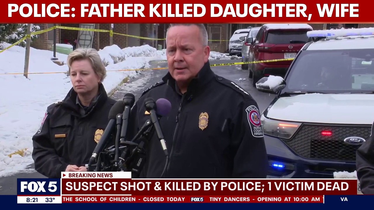 FAIRFAX COUNTY, Va. - Authorities say a man in his 50s stabbed and killed his daughter and wife in their Fairfax County apartment early Monday, then attacked his son‑in‑law before officers arrived and fatally shot him.