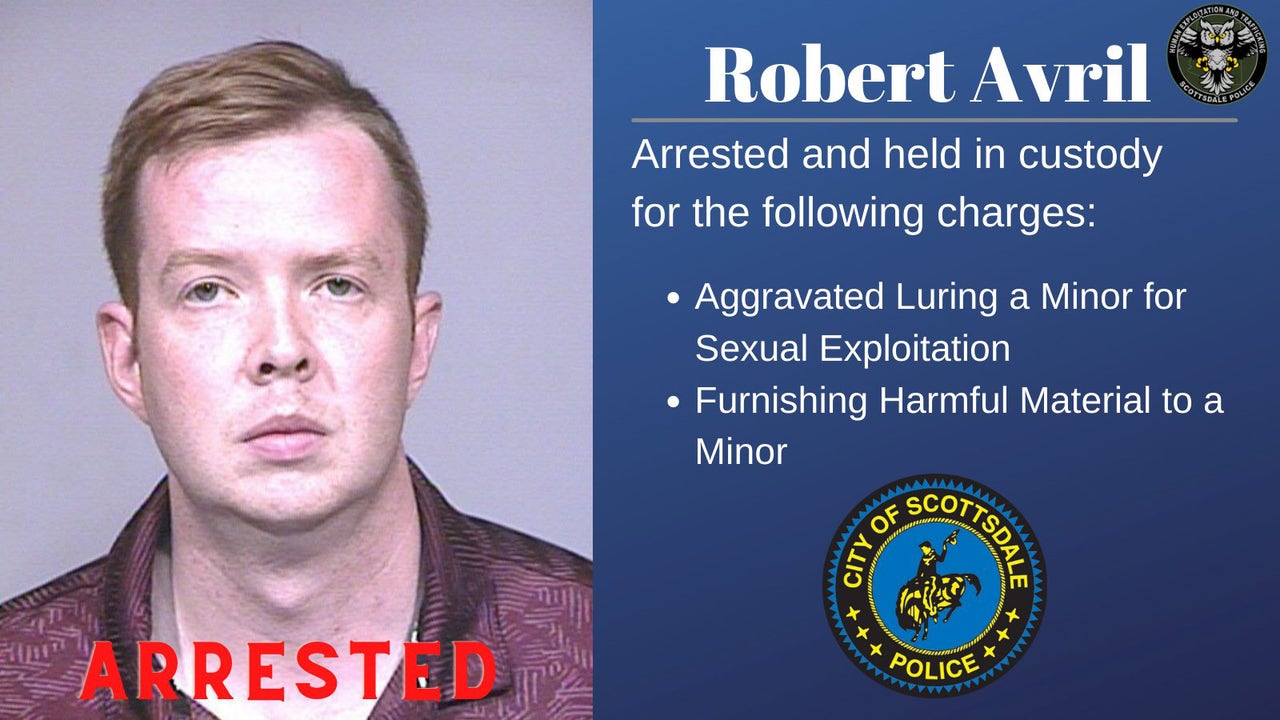 "The Scottsdale Police Department Human Exploitation and Trafficking Unit arrested Robert Paul Avril for Aggravated Luring of a Minor for Sexual Exploitation and Furnishing Harmful Material to a Minor. Mr. Avril communicated online with an undercover detective he believed to be a child and subsequently engaged in a sexually explicit conversation where he disseminated images and videos of himself," police said on May 3.