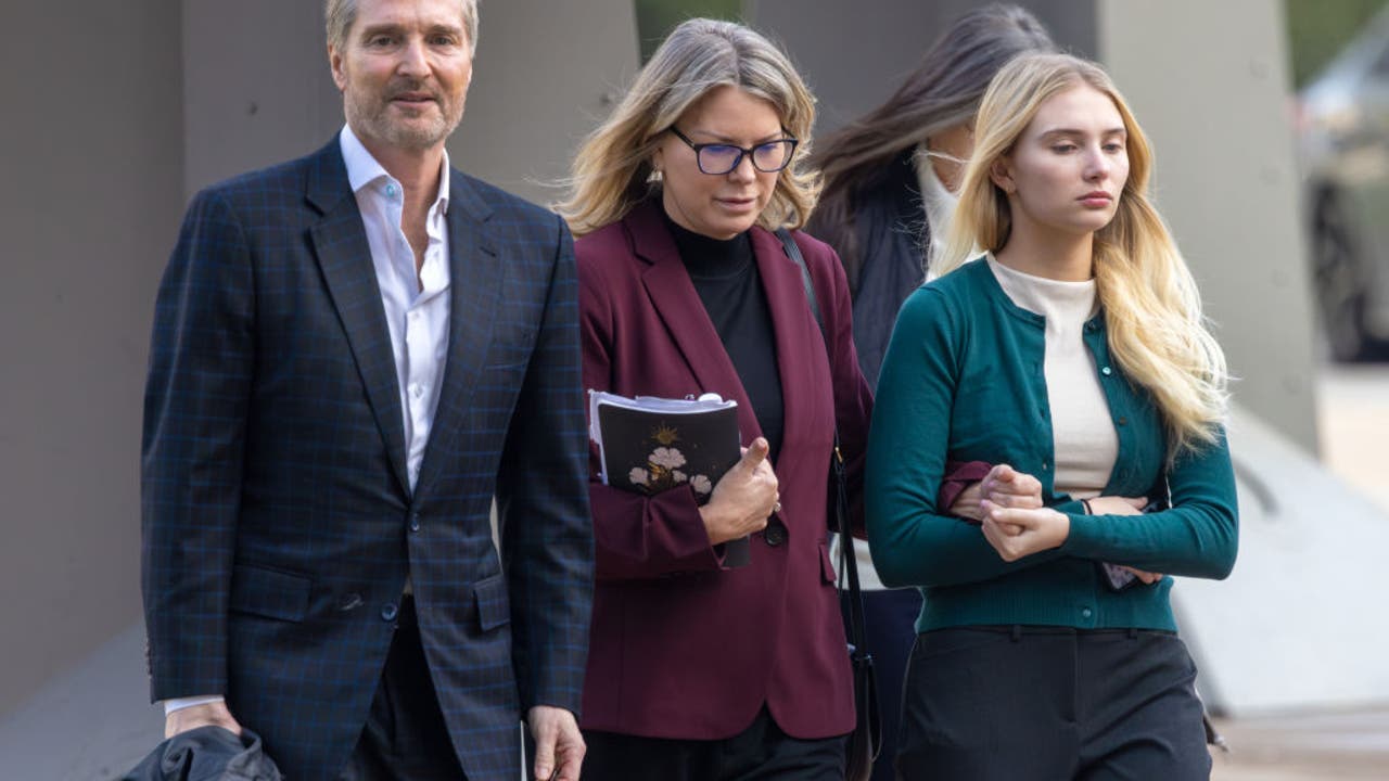 Rebecca Grossman, center, with her husband, Dr. Peter Grossman, left, and daughter heads to Van Nuys Courthouse West Van Nuys, CA. (Irfan Khan / Los Angeles Times via Getty Images)