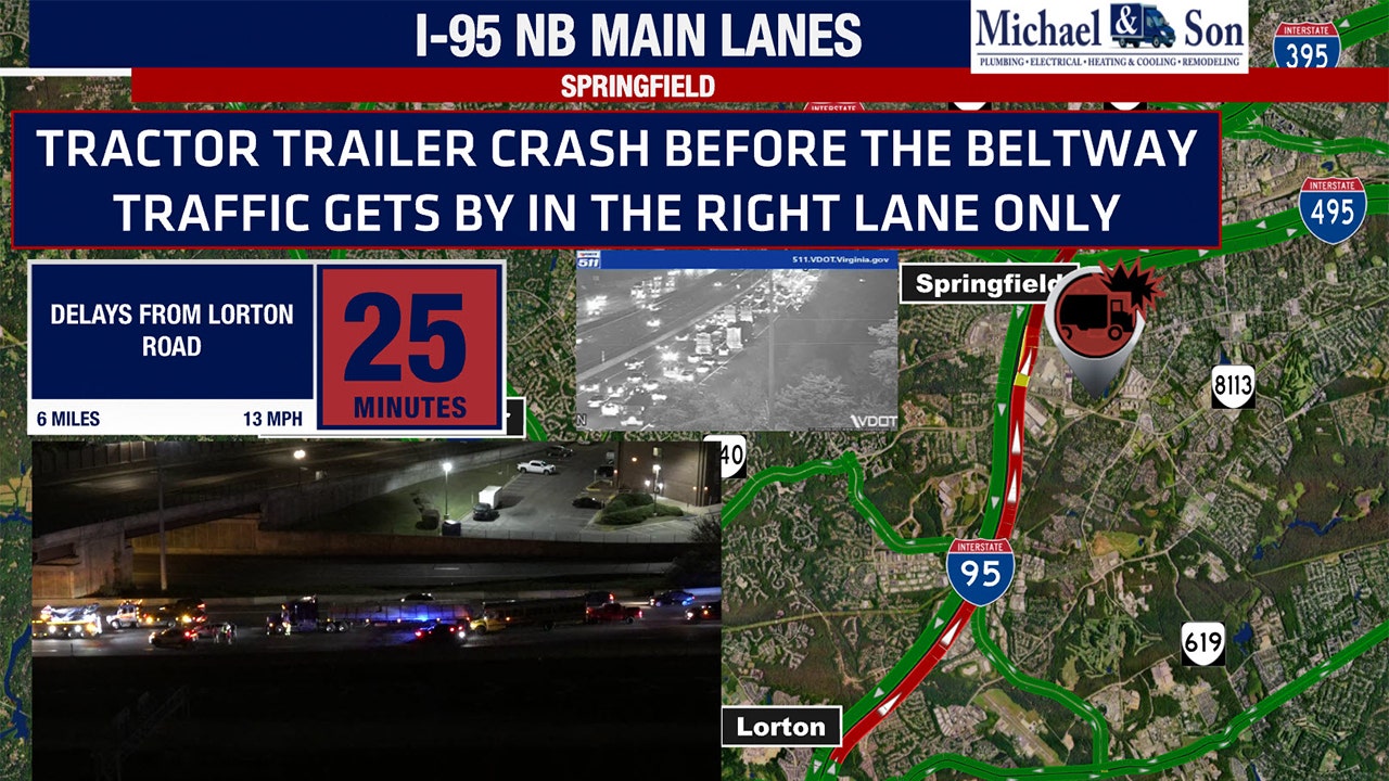 WASHINGTON - A crash involving a school bus and a tractor-trailer is causing delays on northbound I-95 just before Interstate 495 near Springfield.