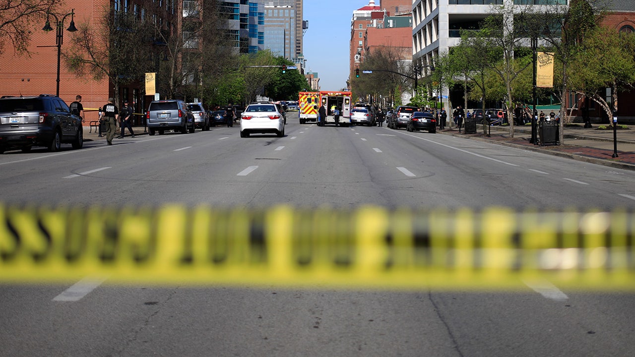 Crime scene tape cordons off a street as law enforcement officers respond to an active shooter near the Old National Bank building on April 10, 2023 in Louisville, Kentucky. According to initial reports, there are multiple casualties but the shooter