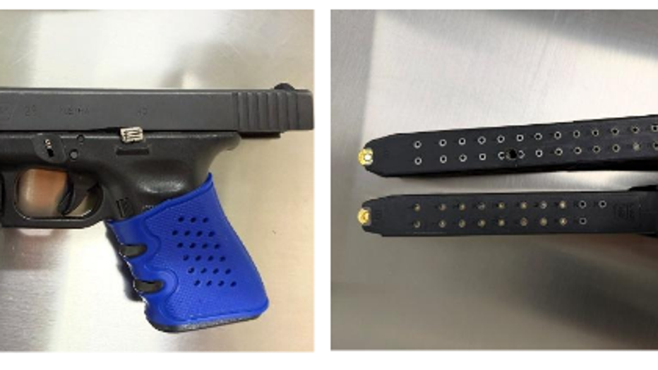 Inside was a loaded .40 caliber Glock handgun with an extended magazine. The serial number had been scratched out.