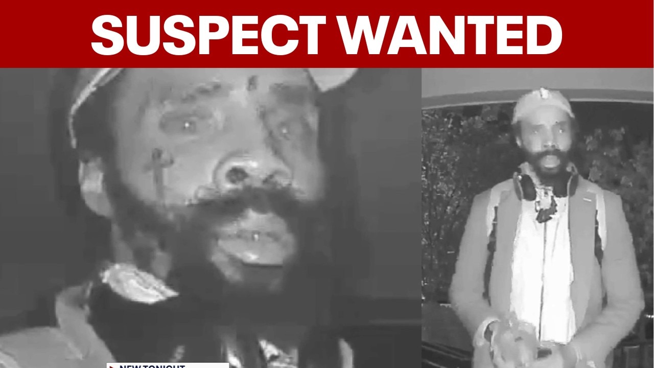Doorbell camera footage shows the suspect with headphones around his neck, a beard and a distinctive tattoo of a cross under his eye.