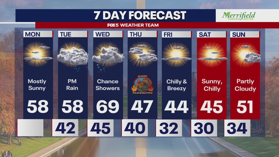 A sunny, cool and dry Monday across the Washington, D.C. region with temperatures in the upper-50s ahead of a chilly Thanksgiving.