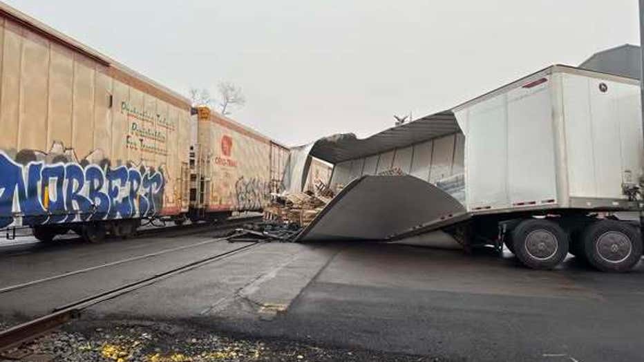 Photos from the scene show a tractor-trailer stopped across railroad tracks, with visible damage to the trailer and train cars involved in the collision.
