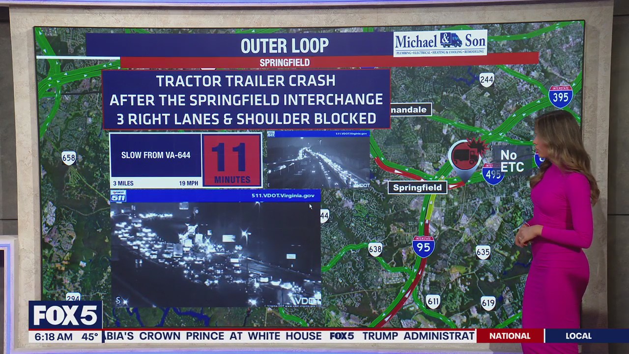 SPRINGFIELD, Va. - A tractor-trailer crash along the Outer Loop of I-495 in Virginia is causing delays Wednesday morning.